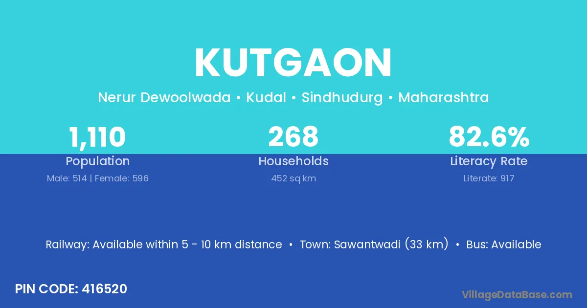 Sawantwadi (33 km) is the nearest town to Kutgaon village for major economic activities and is located approximately 33 km away.