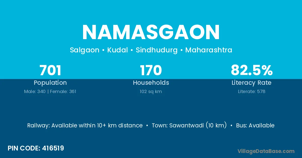 Sawantwadi (10 km) is the nearest town to Namasgaon village for major economic activities and is located approximately 10 km away.