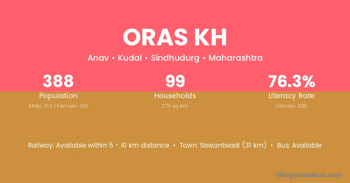 Sawantwadi (31 km) is the nearest town to Oras Kh village for major economic activities and is located approximately 31 km away.