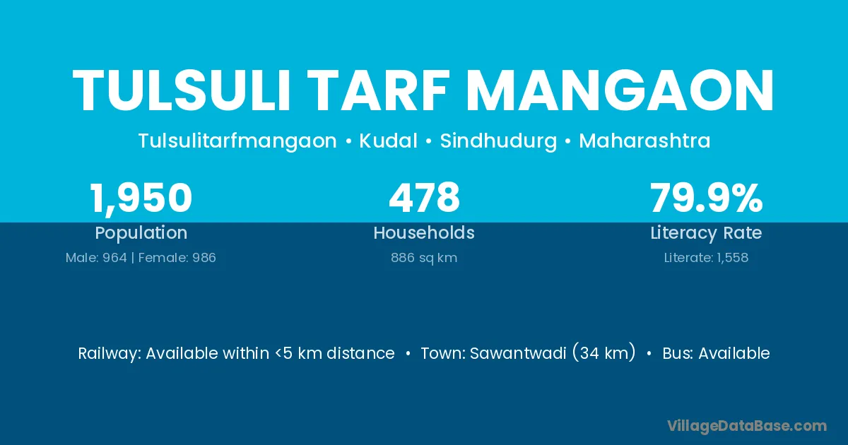 Sawantwadi (34 km) is the nearest town to Tulsuli Tarf Mangaon village for major economic activities and is located approximately 34 km away.