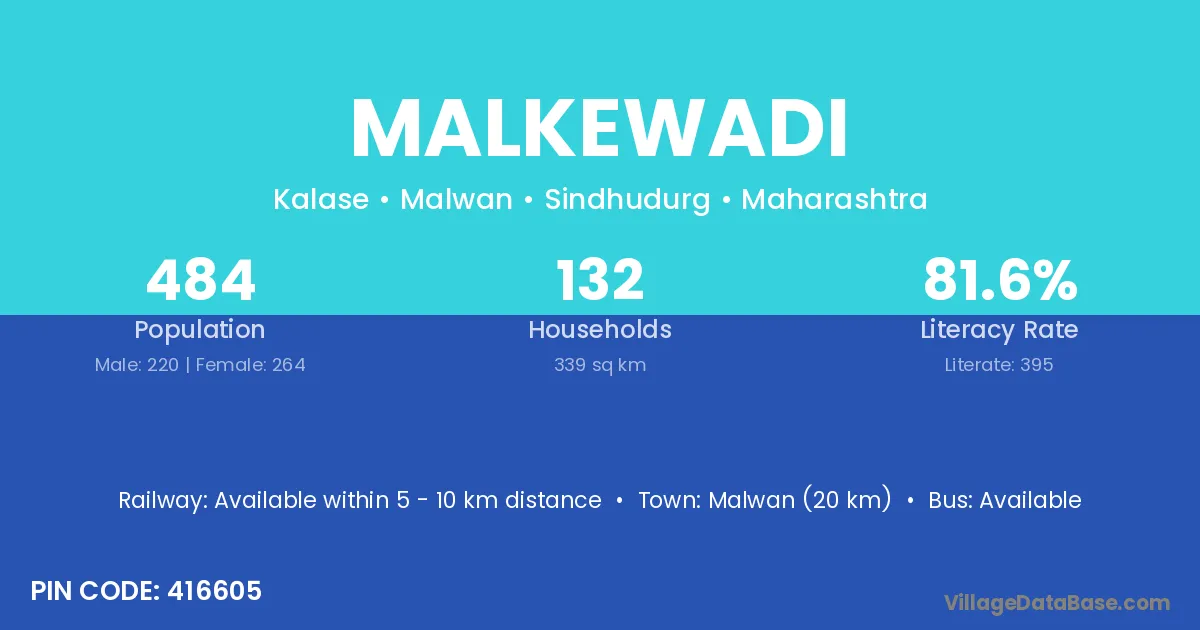 Malwan (20 km) is the nearest town to Malkewadi village for major economic activities and is located approximately 20 km away.