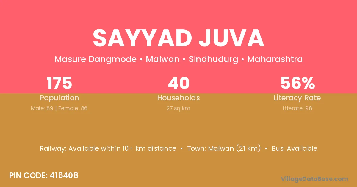 Malwan (21 km) is the nearest town to Sayyad Juva village for major economic activities and is located approximately 21 km away.