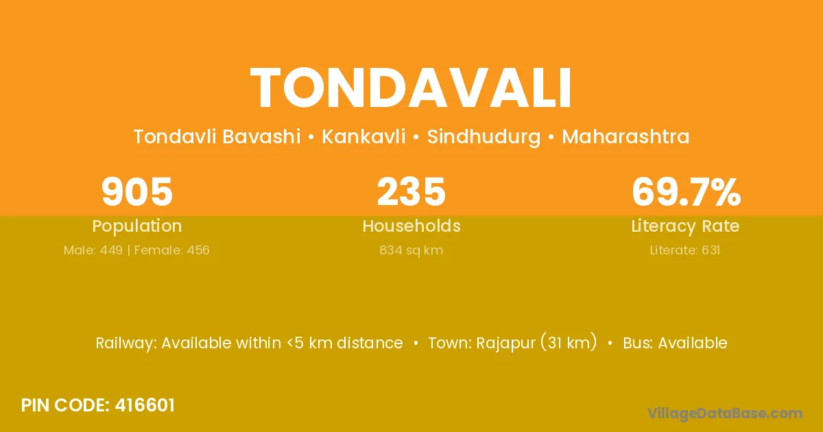 Malwan (27 km) is the nearest town to Tondavali village for major economic activities and is located approximately 27 km away.