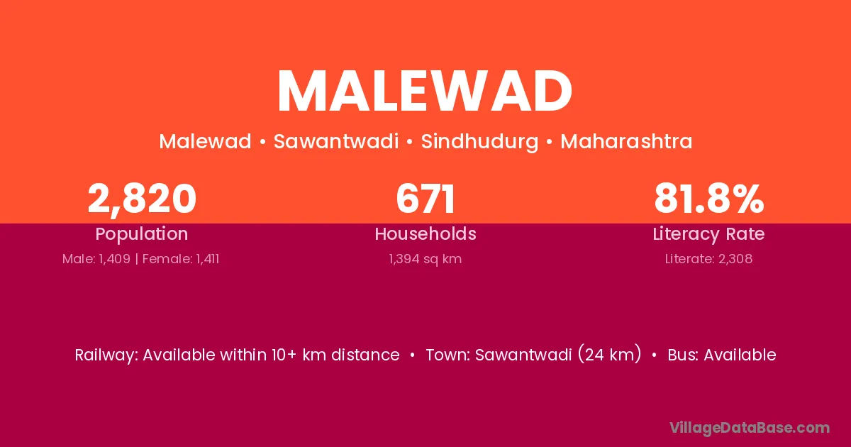 Sawantwadi (24 km) is the nearest town to Malewad village for major economic activities and is located approximately 24 km away.