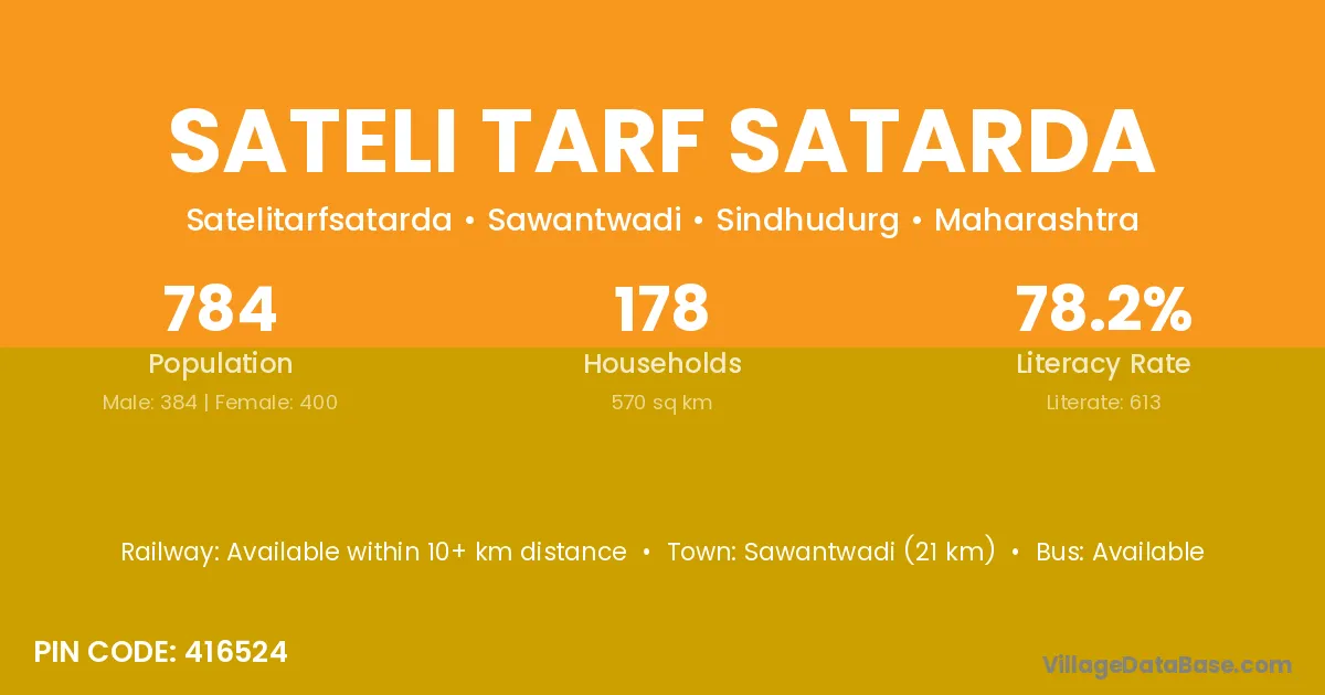 Sawantwadi (21 km) is the nearest town to Sateli Tarf Satarda village for major economic activities and is located approximately 21 km away.