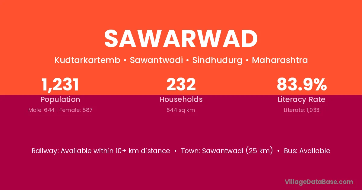Sawarwad village has a total population of 1,231 people, of which 644 are males and 587 are females.
