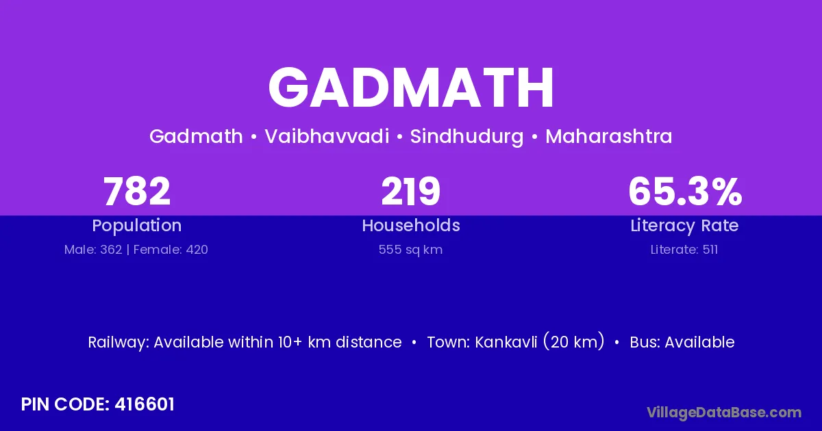Kankavli (20 km) is the nearest town to Gadmath village for major economic activities and is located approximately 20 km away.