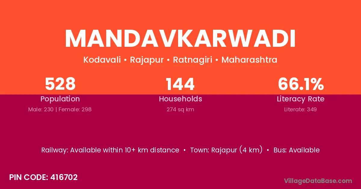 Rajapur (45 km) is the nearest town to Mandavkarwadi village for major economic activities and is located approximately 45 km away.