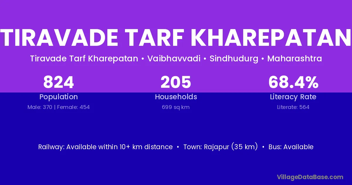 Rajapur (35 km) is the nearest town to Tiravade Tarf Kharepatan village for major economic activities and is located approximately 35 km away.