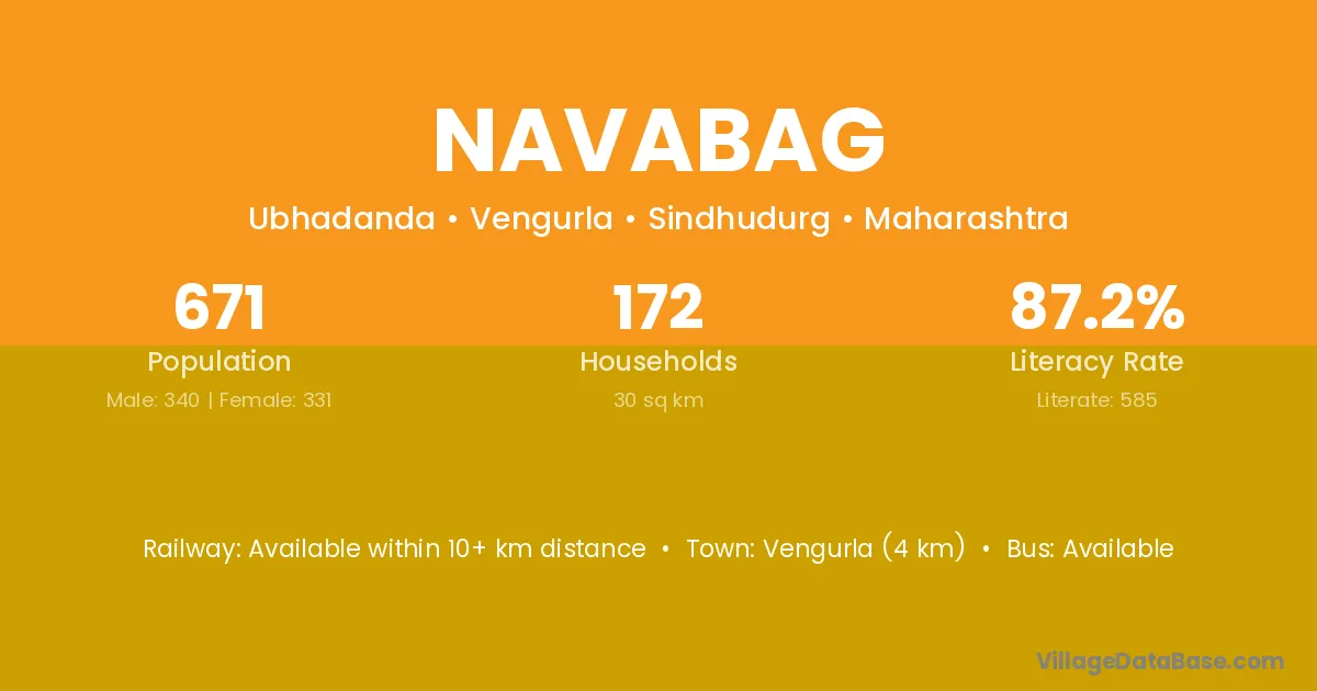 Vengurla (4 km) is the nearest town to Navabag village for major economic activities and is located approximately 4 km away.