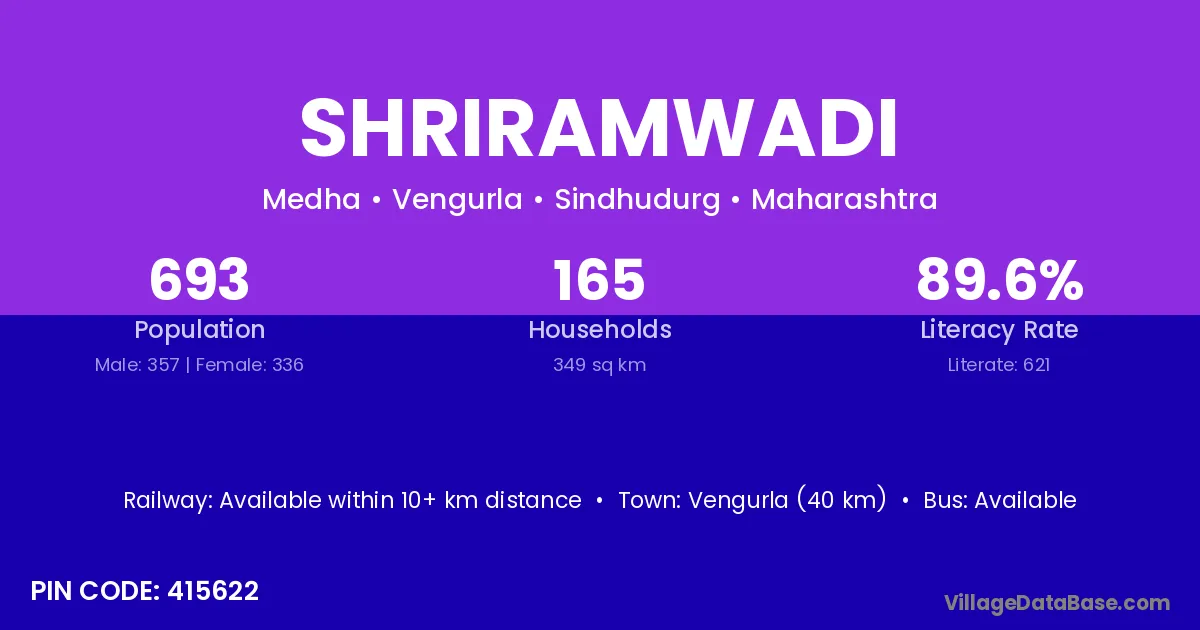 Vengurla (40 km) is the nearest town to Shriramwadi village for major economic activities and is located approximately 40 km away.