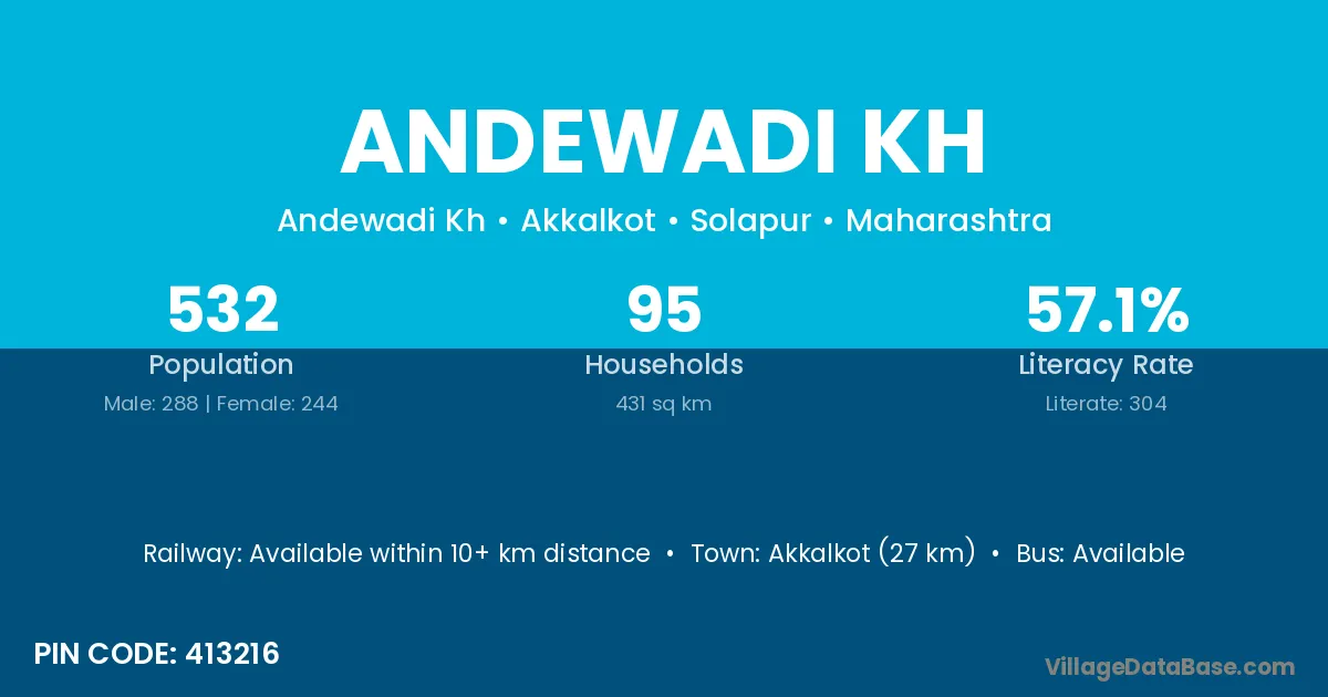 Akkalkot (27 km) is the nearest town to Andewadi Kh village for major economic activities and is located approximately 27 km away.