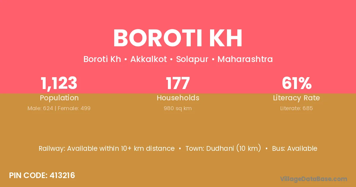 Dudhani (10 km) is the nearest town to Boroti Kh village for major economic activities and is located approximately 10 km away.