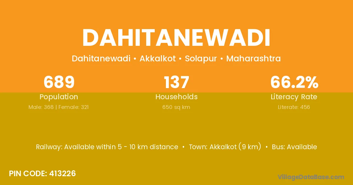 Dahitanewadi village has a total population of 689 people, of which 368 are males and 321 are females.