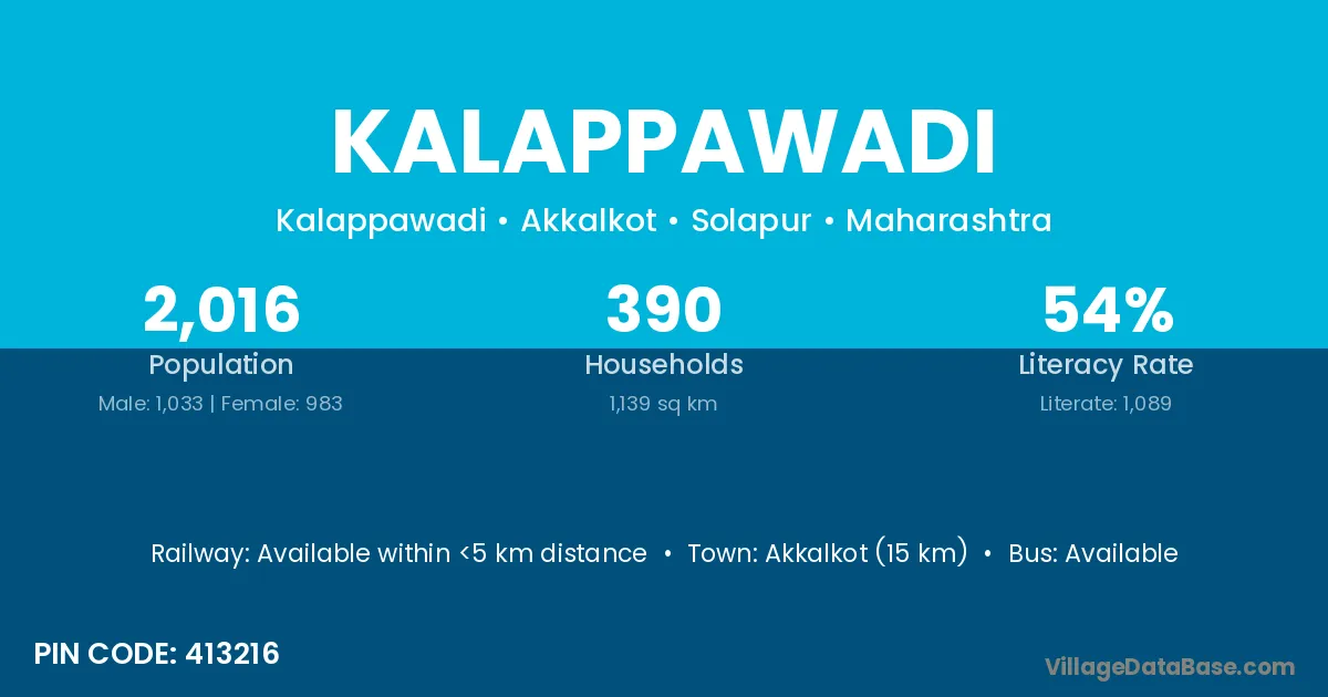 Akkalkot (15 km) is the nearest town to Kalappawadi village for major economic activities and is located approximately 15 km away.