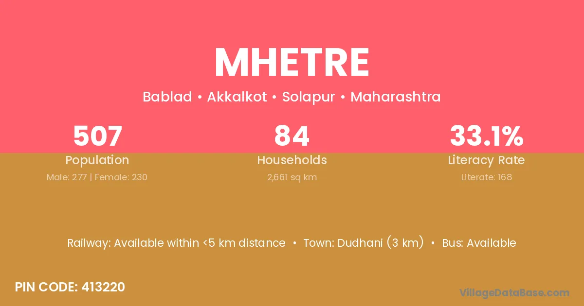 Dudhani (3 km) is the nearest town to Mhetre village for major economic activities and is located approximately 3 km away.