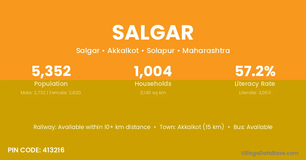Akkalkot (15 km) is the nearest town to Salgar village for major economic activities and is located approximately 15 km away.