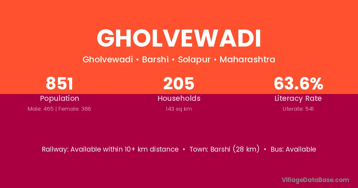 Barshi (28 km) is the nearest town to Gholvewadi village for major economic activities and is located approximately 28 km away.