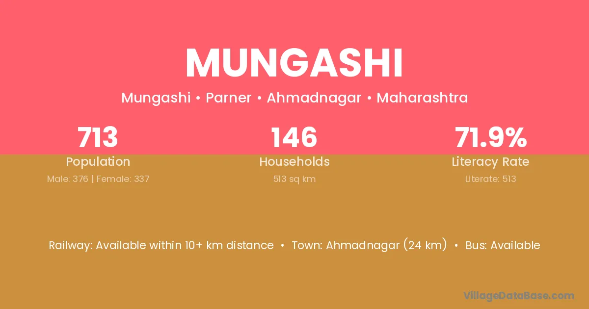 Barshi (32 km) is the nearest town to Mungashi village for major economic activities and is located approximately 32 km away.