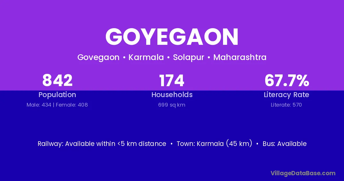 Karmala (45 km) is the nearest town to Goyegaon village for major economic activities and is located approximately 45 km away.
