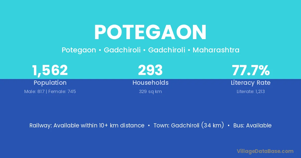 Karmala (11 km) is the nearest town to Potegaon village for major economic activities and is located approximately 11 km away.