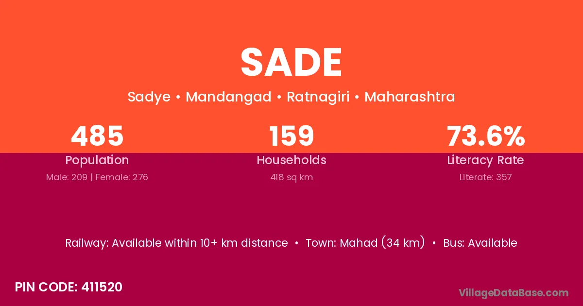 Karmala (22 km) is the nearest town to Sade village for major economic activities and is located approximately 22 km away.