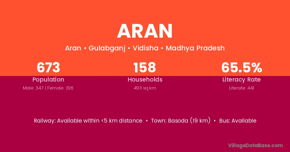The literacy rate of Aran village is 68.40%. Male literacy stands at 75.22% and female literacy at 61.27%.