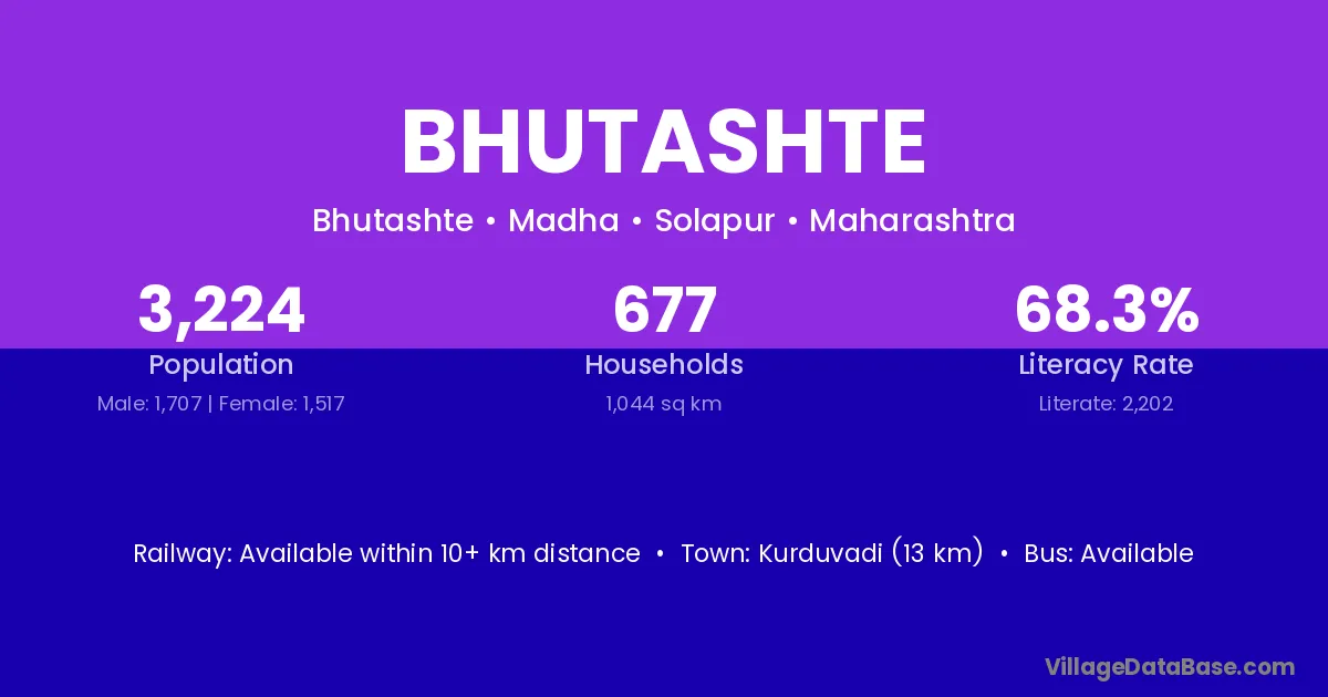 Kurduvadi (13 km) is the nearest town to Bhutashte village for major economic activities and is located approximately 13 km away.