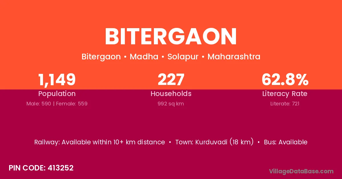 Kurduvadi (18 km) is the nearest town to Bitergaon village for major economic activities and is located approximately 18 km away.