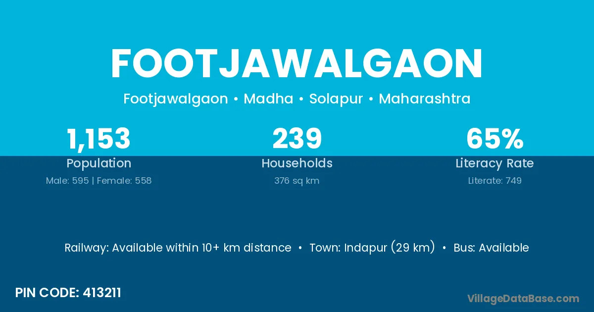 Indapur (29 km) is the nearest town to Footjawalgaon village for major economic activities and is located approximately 29 km away.