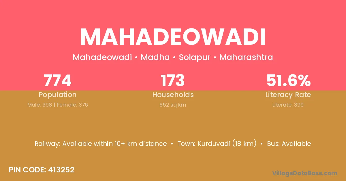 Kurduvadi (18 km) is the nearest town to Mahadeowadi village for major economic activities and is located approximately 18 km away.