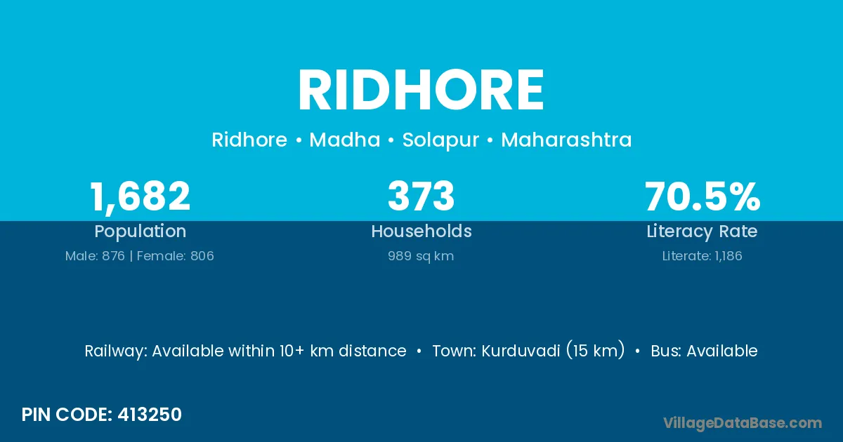 Kurduvadi (15 km) is the nearest town to Ridhore village for major economic activities and is located approximately 15 km away.