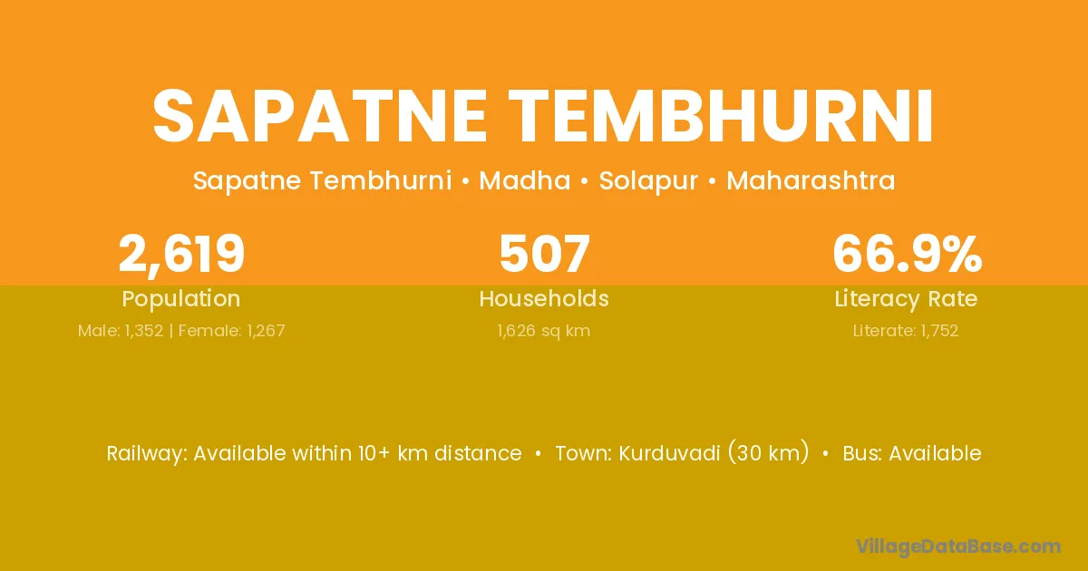 Kurduvadi (30 km) is the nearest town to Sapatne Tembhurni village for major economic activities and is located approximately 30 km away.