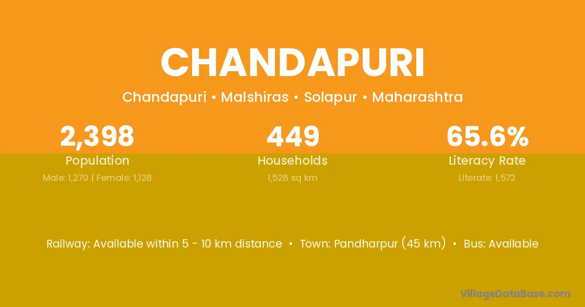 Pandharpur (45 km) is the nearest town to Chandapuri village for major economic activities and is located approximately 45 km away.