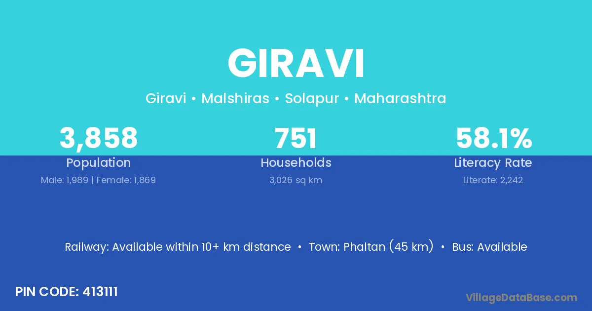 Phaltan (45 km) is the nearest town to Giravi village for major economic activities and is located approximately 45 km away.