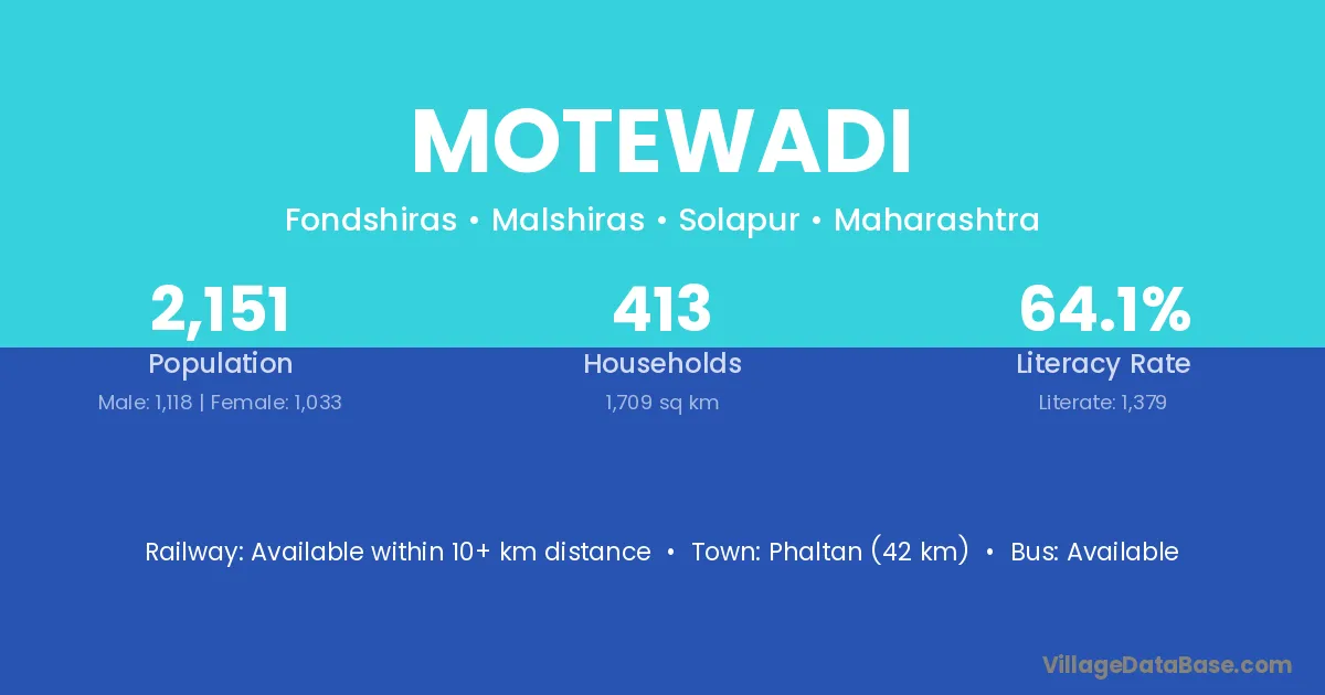 Phaltan (42 km) is the nearest town to Motewadi village for major economic activities and is located approximately 42 km away.