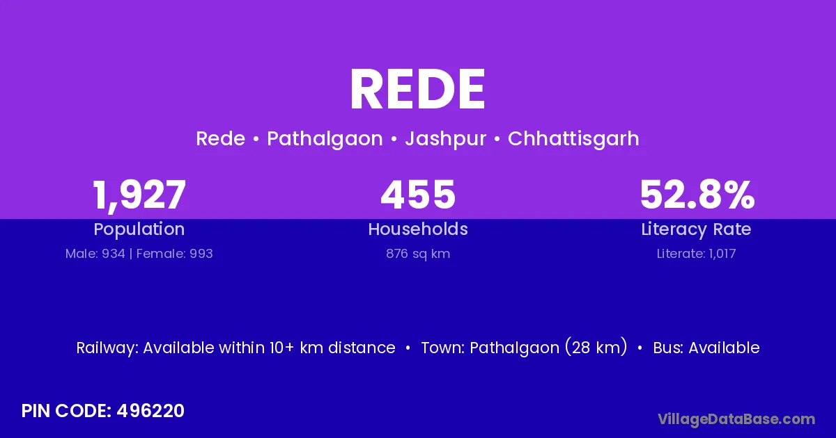 The literacy rate of Rede village is 52.77%. Male literacy stands at 62.45% and female literacy at 42.65%.