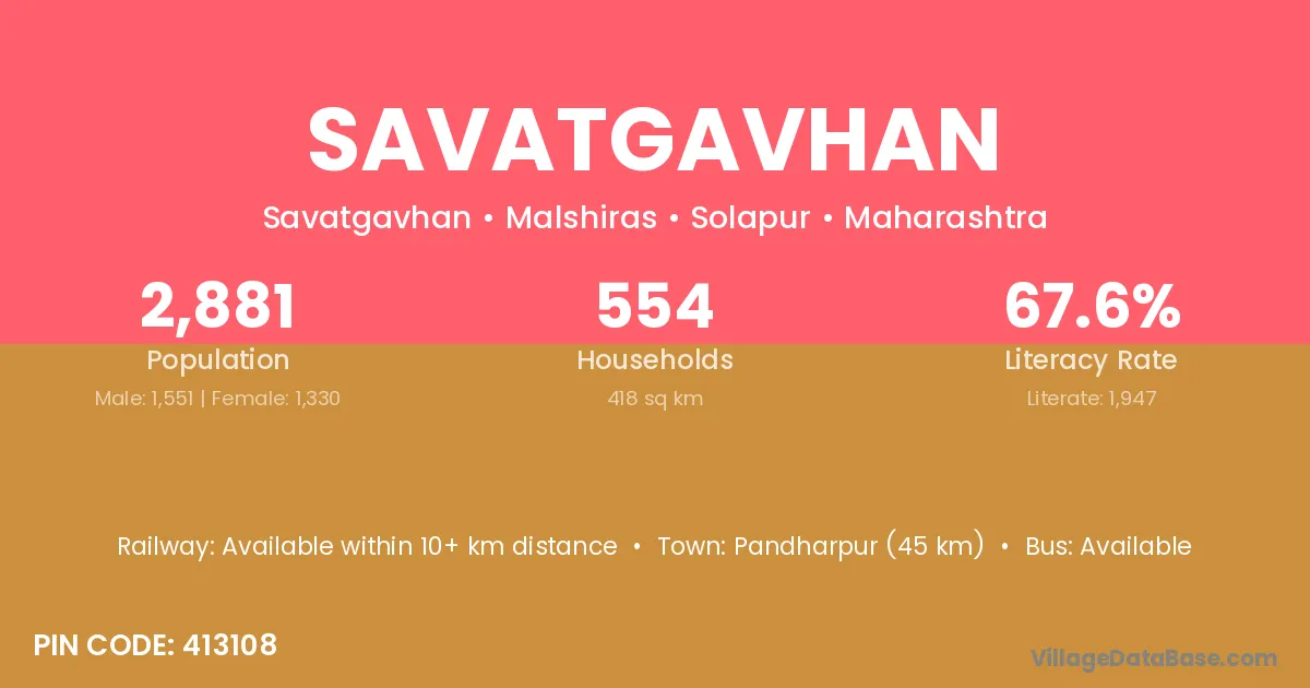 Pandharpur (45 km) is the nearest town to Savatgavhan village for major economic activities and is located approximately 45 km away.