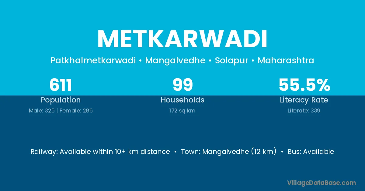 Mangalvedhe (12 km) is the nearest town to Metkarwadi village for major economic activities and is located approximately 12 km away.