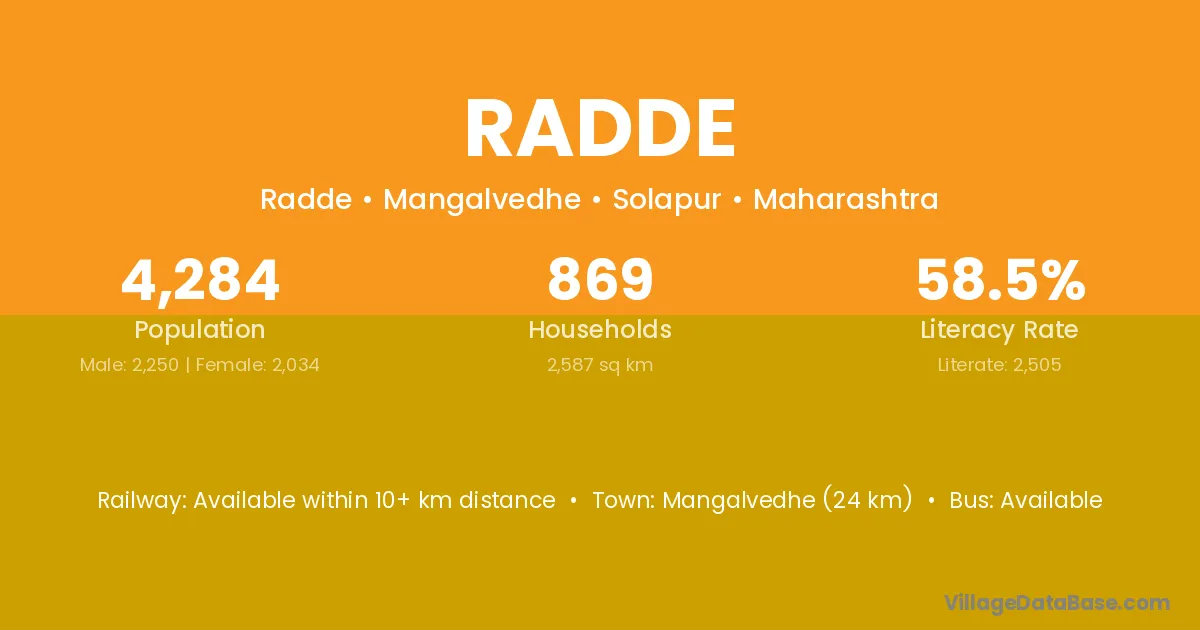 Mangalvedhe (24 km) is the nearest town to Radde village for major economic activities and is located approximately 24 km away.