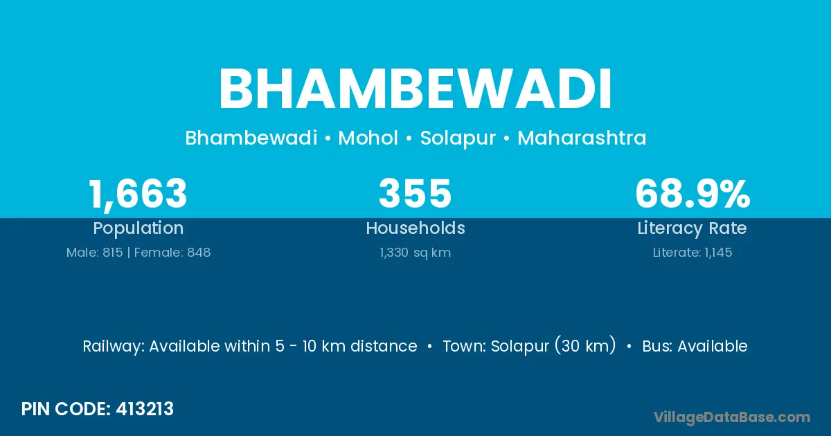 Solapur (30 km) is the nearest town to Bhambewadi village for major economic activities and is located approximately 30 km away.
