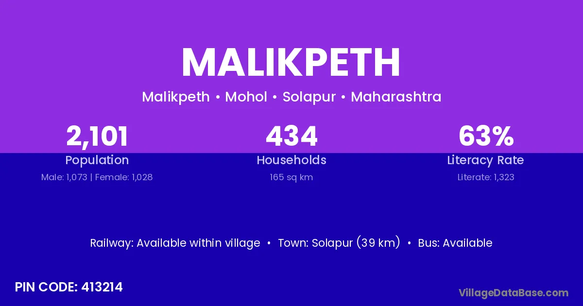 Solapur (39 km) is the nearest town to Malikpeth village for major economic activities and is located approximately 39 km away.