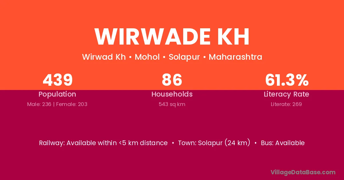 Solapur (24 km) is the nearest town to Wirwade Kh village for major economic activities and is located approximately 24 km away.