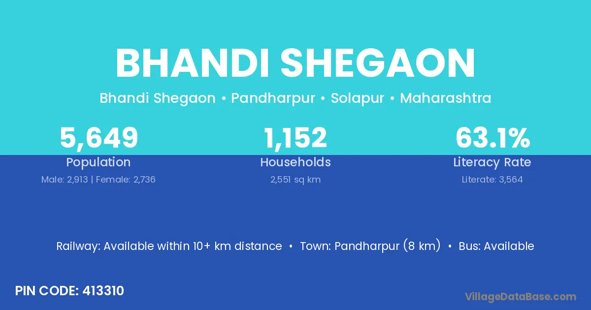 Pandharpur (8 km) is the nearest town to Bhandi Shegaon village for major economic activities and is located approximately 8 km away.
