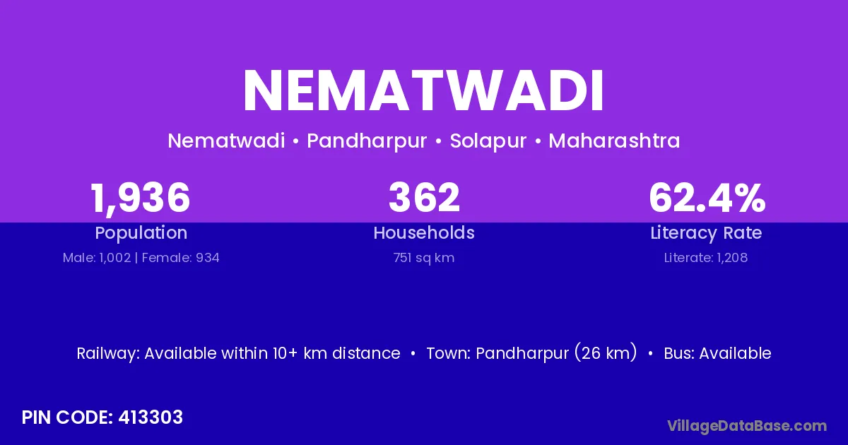 Pandharpur (26 km) is the nearest town to Nematwadi village for major economic activities and is located approximately 26 km away.