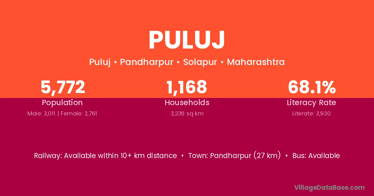 Pandharpur (27 km) is the nearest town to Puluj village for major economic activities and is located approximately 27 km away.