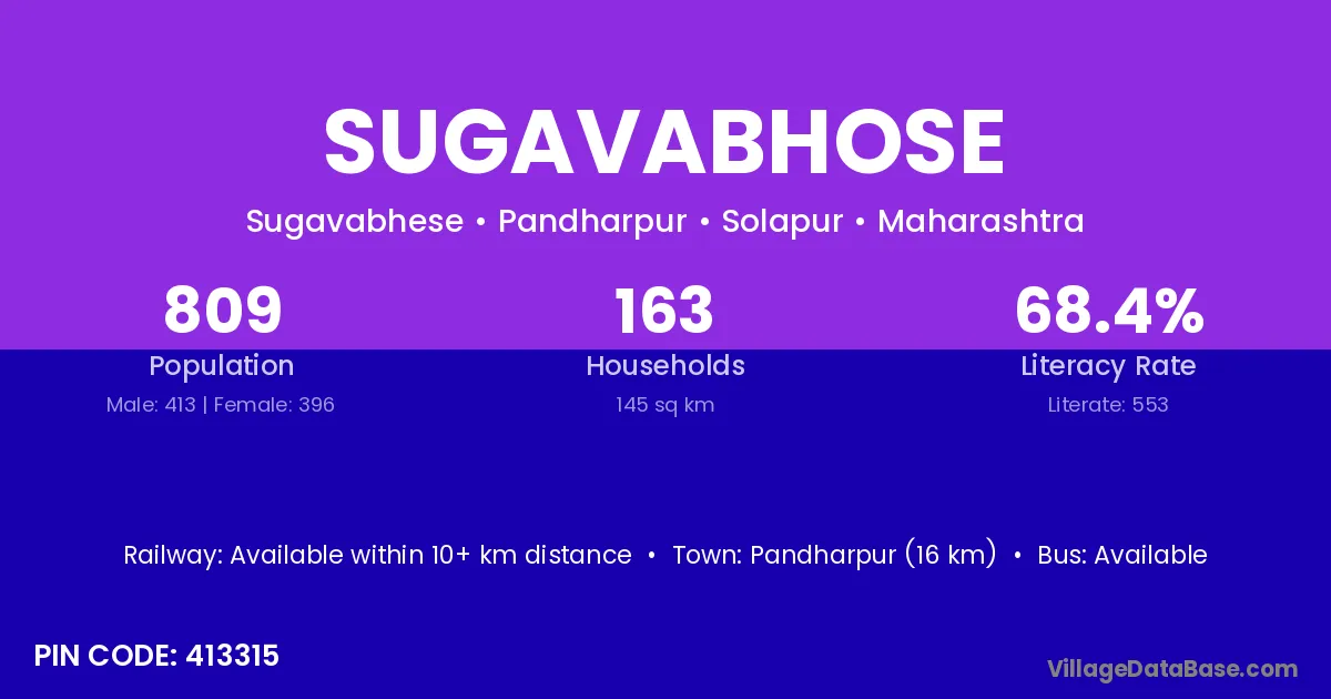 Pandharpur (16 km) is the nearest town to Sugavabhose village for major economic activities and is located approximately 16 km away.