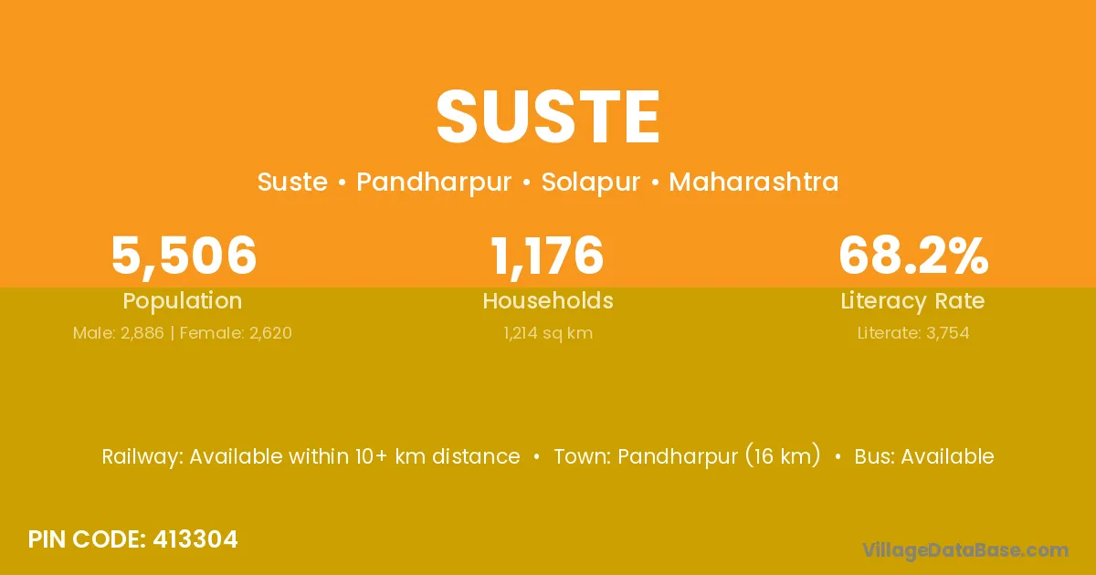 Pandharpur (16 km) is the nearest town to Suste village for major economic activities and is located approximately 16 km away.