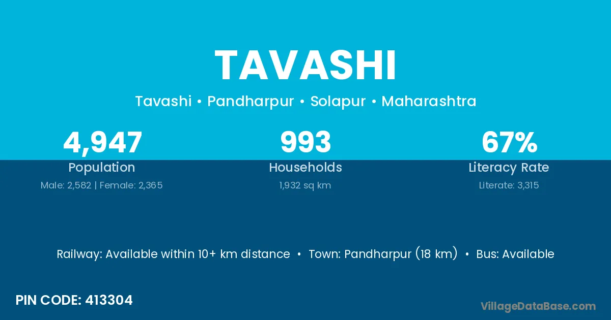 Pandharpur (18 km) is the nearest town to Tavashi village for major economic activities and is located approximately 18 km away.