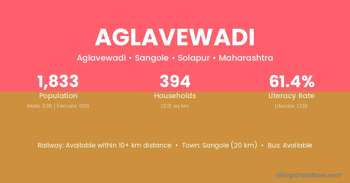Aglavewadi village has a total population of 1,833 people, of which 938 are males and 895 are females.